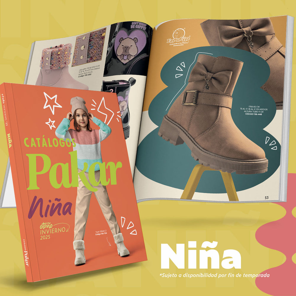 • Catálogos impresos de: Bota, Mujer, Casual, Hombre, Niño/Junior, Niña y Ropa OI25. *Sujeto a disponibilidad por fin de temporada*